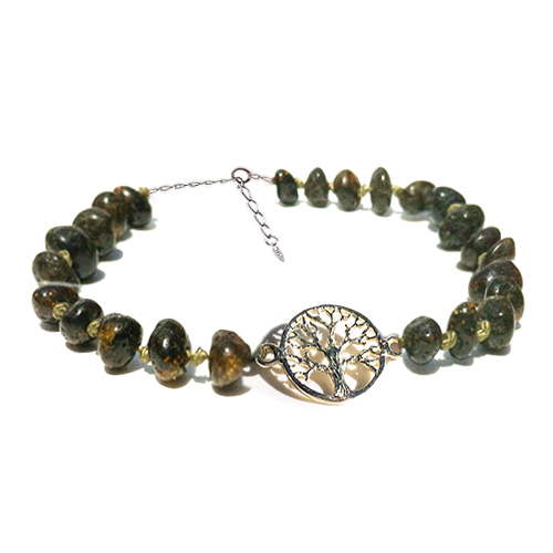 Pulsera de tobillo para adulto, elaborada con Ámbar del Mar Báltico color verde con dije del árbol de la vida en plata Esterlina ley .925